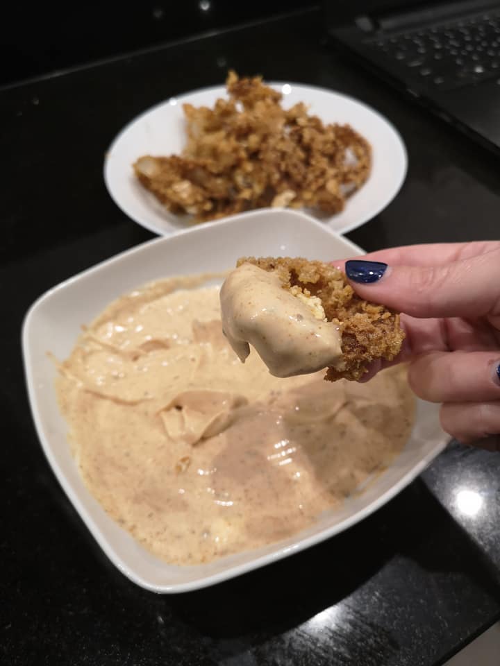 Αν δεν θέλετε να αγοράσετε pork rinds, μπορείτε να κάνετε δοκιμή με τα εξής υλικά στις εξής αναλογίες: 3 κ.σ. παρμεζάνα, 2 κ.σ. χρυσό, ή καφέ λιναρόσπορο σπασμένο και 1 κ.σ. αλεύρι αμυγδάλου. ΔΕΝ ΤΟ ΕΧΩ ΔΟΚΙΜΑΣΕΙ, δεν ξέρω τι θα βγει, αλλά σε αυτή την περίπτωση θα βουτήξετε τα κρεμμύδια μία σε αυγό και μία στο παραπάνω μείγμα και μετά πάλι στο αυγό και τέλος στο μείγμα, ώστε να γίνει μια καλή κρούστα.